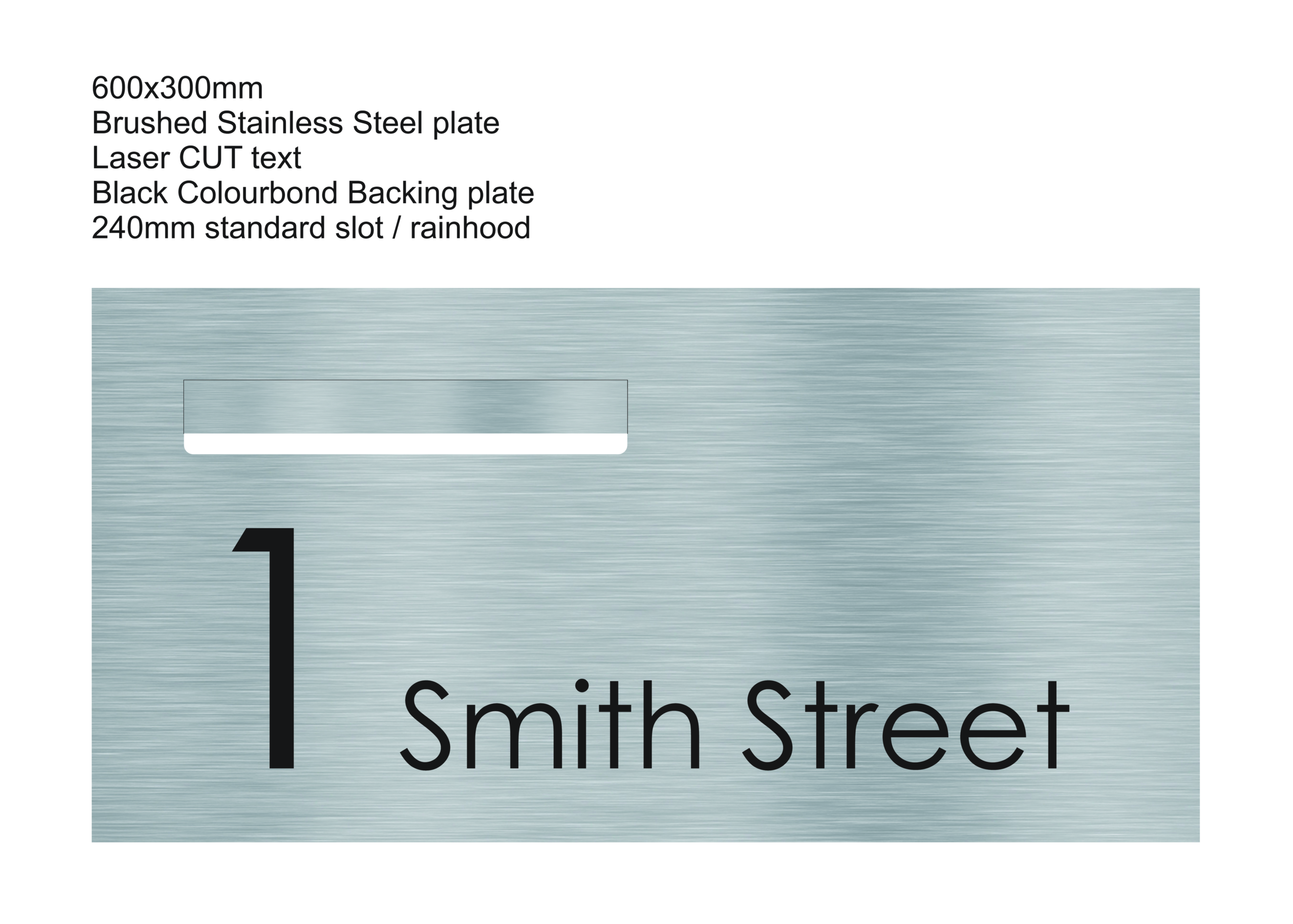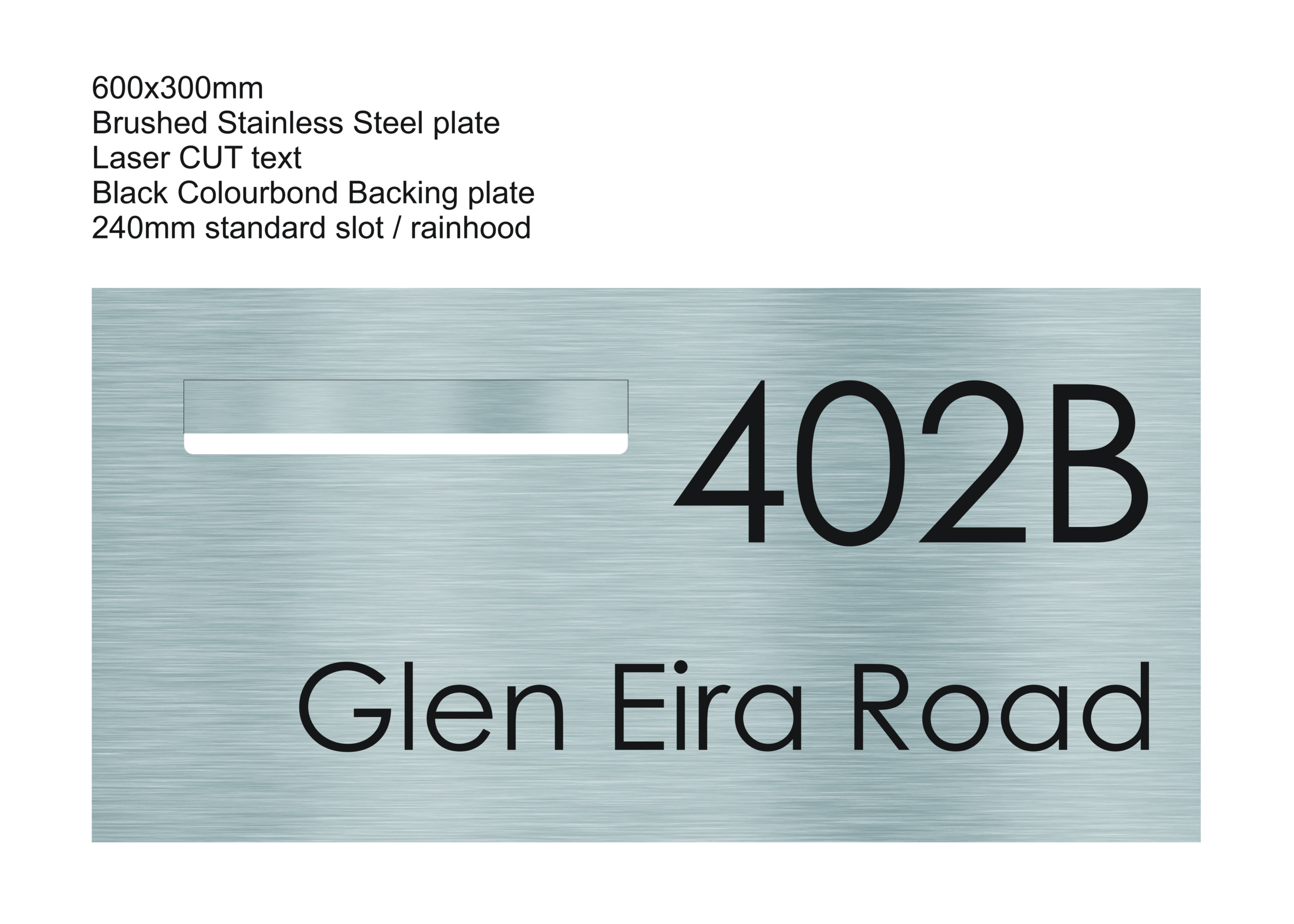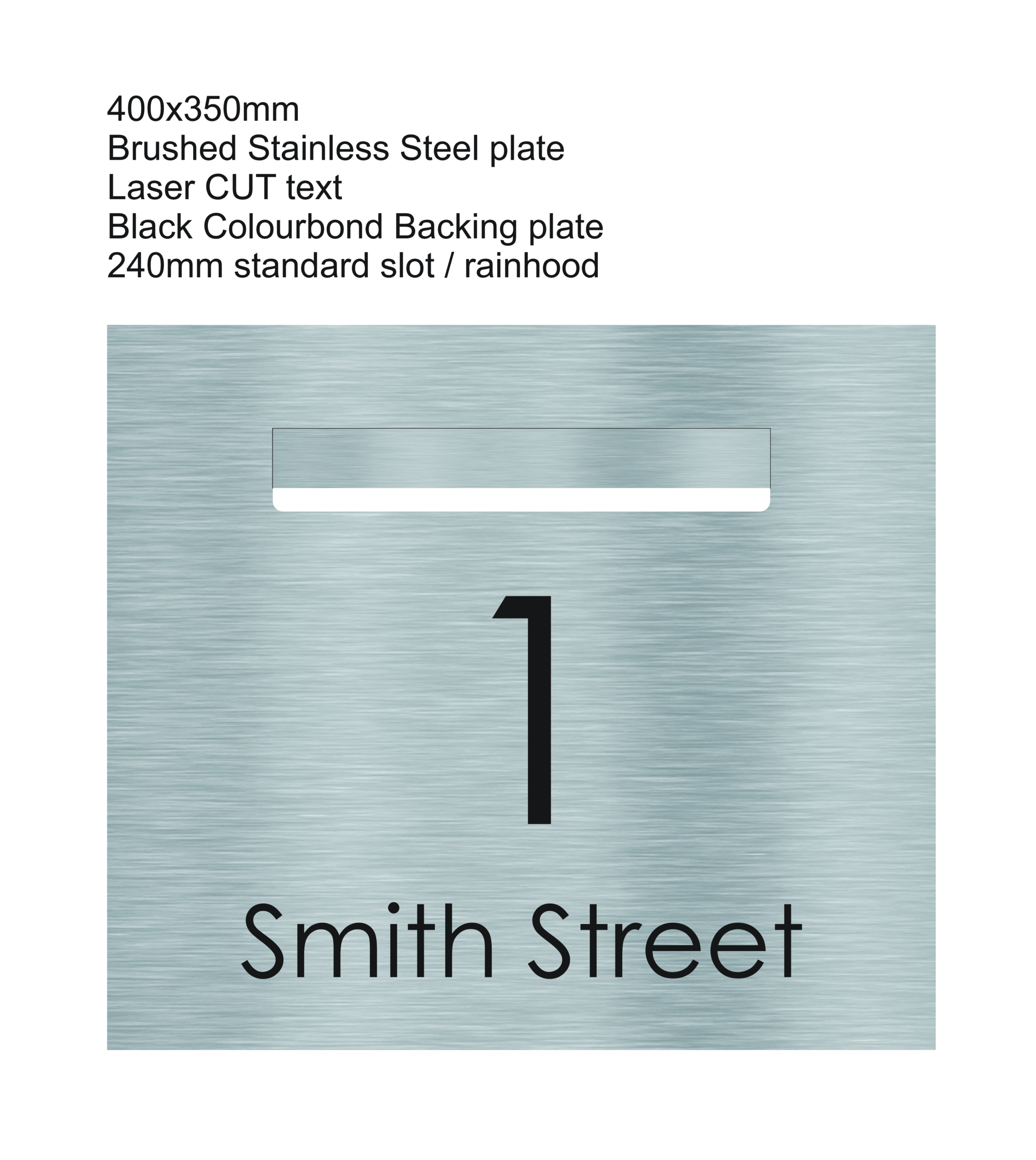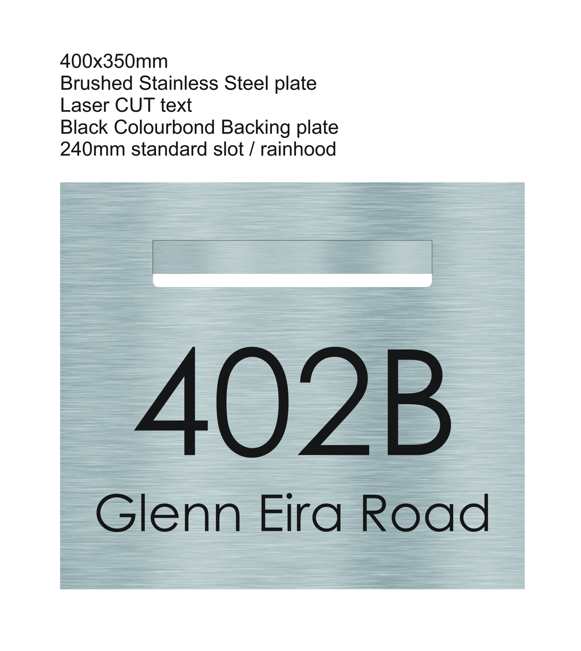Custom stainless steel faceplate with mail slot and rain hood. Available in 3 sizes and finishes, and fully personalised with your address details. Built to last in all weather.