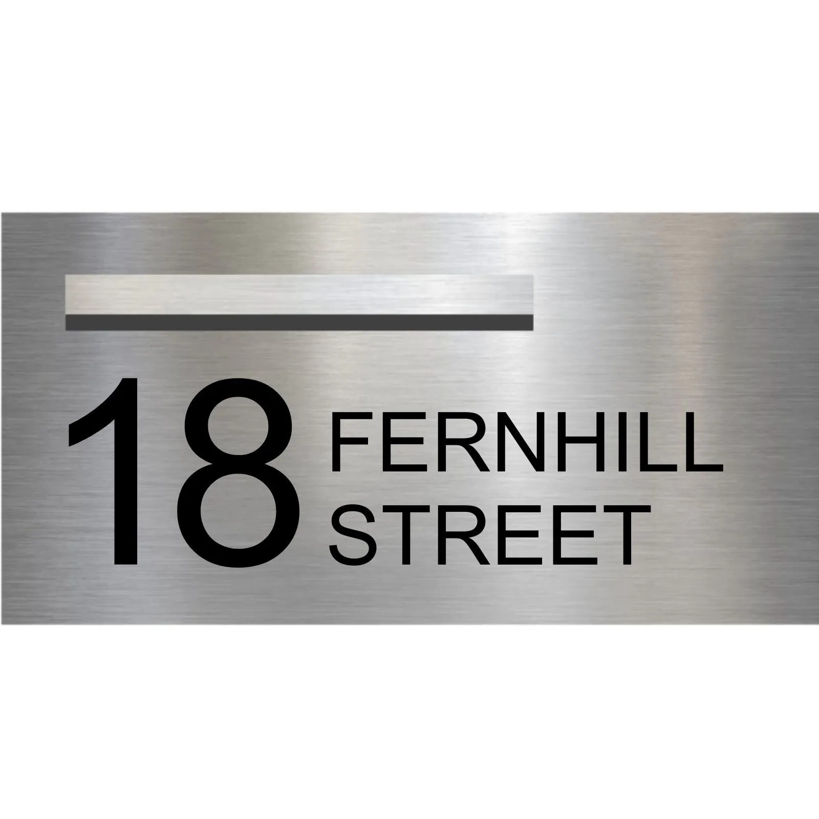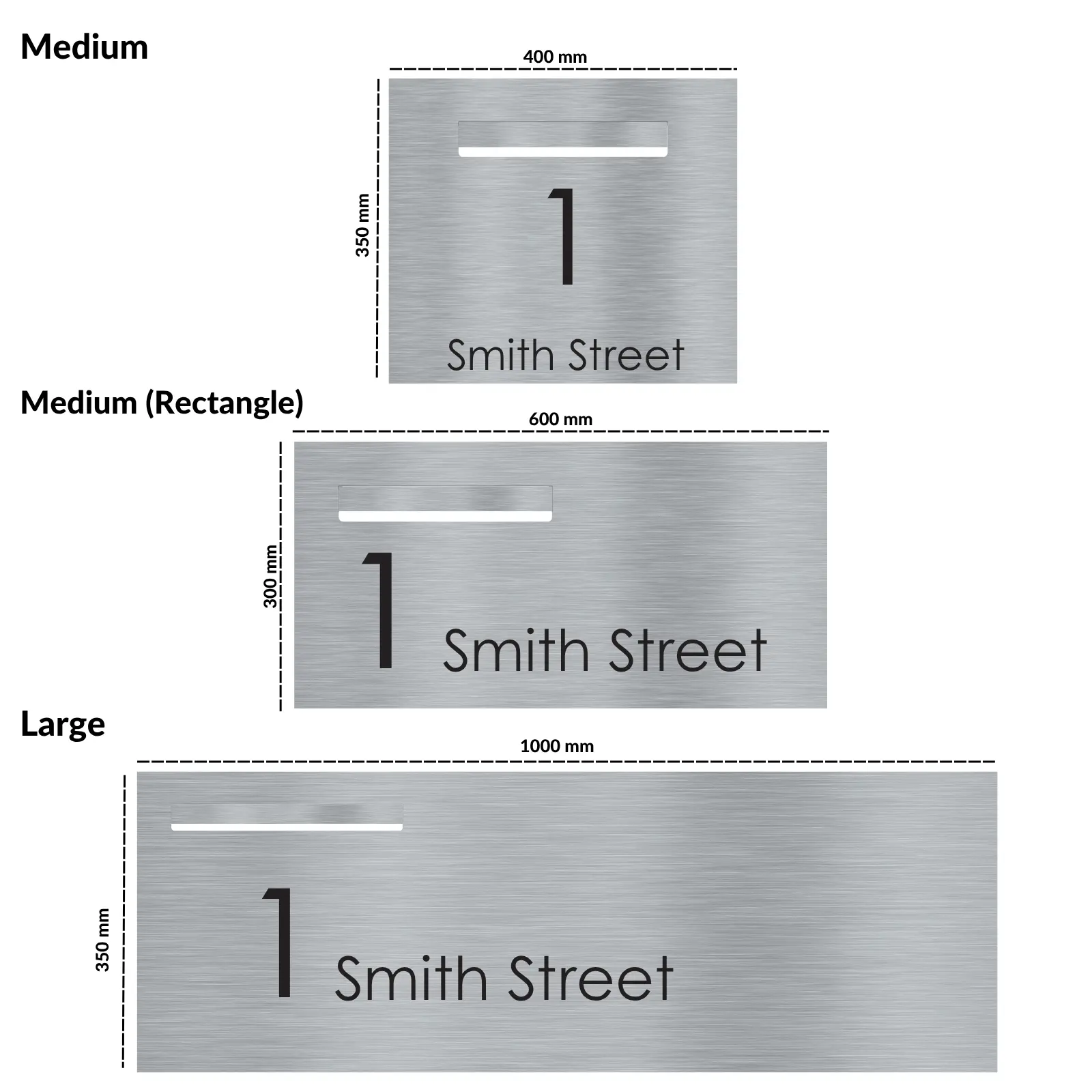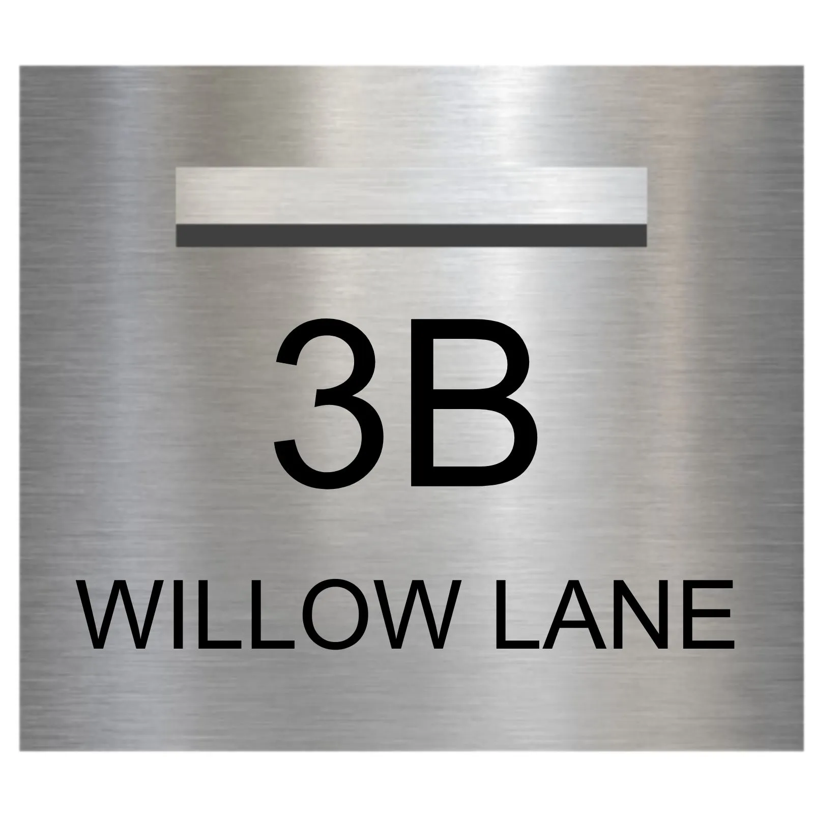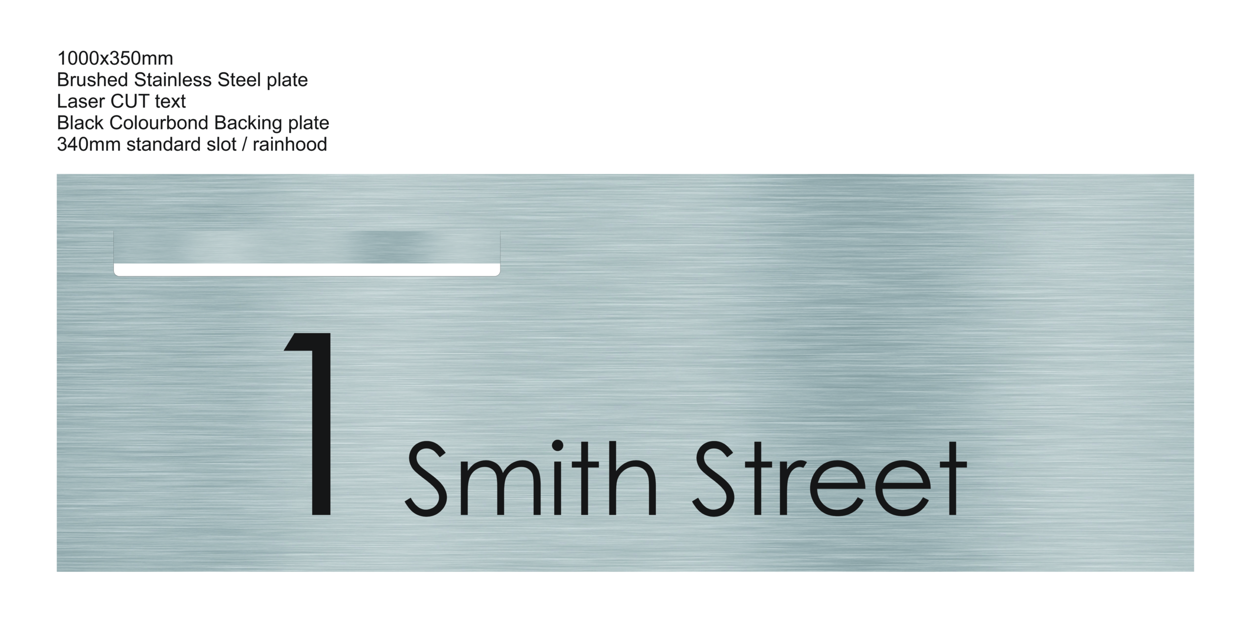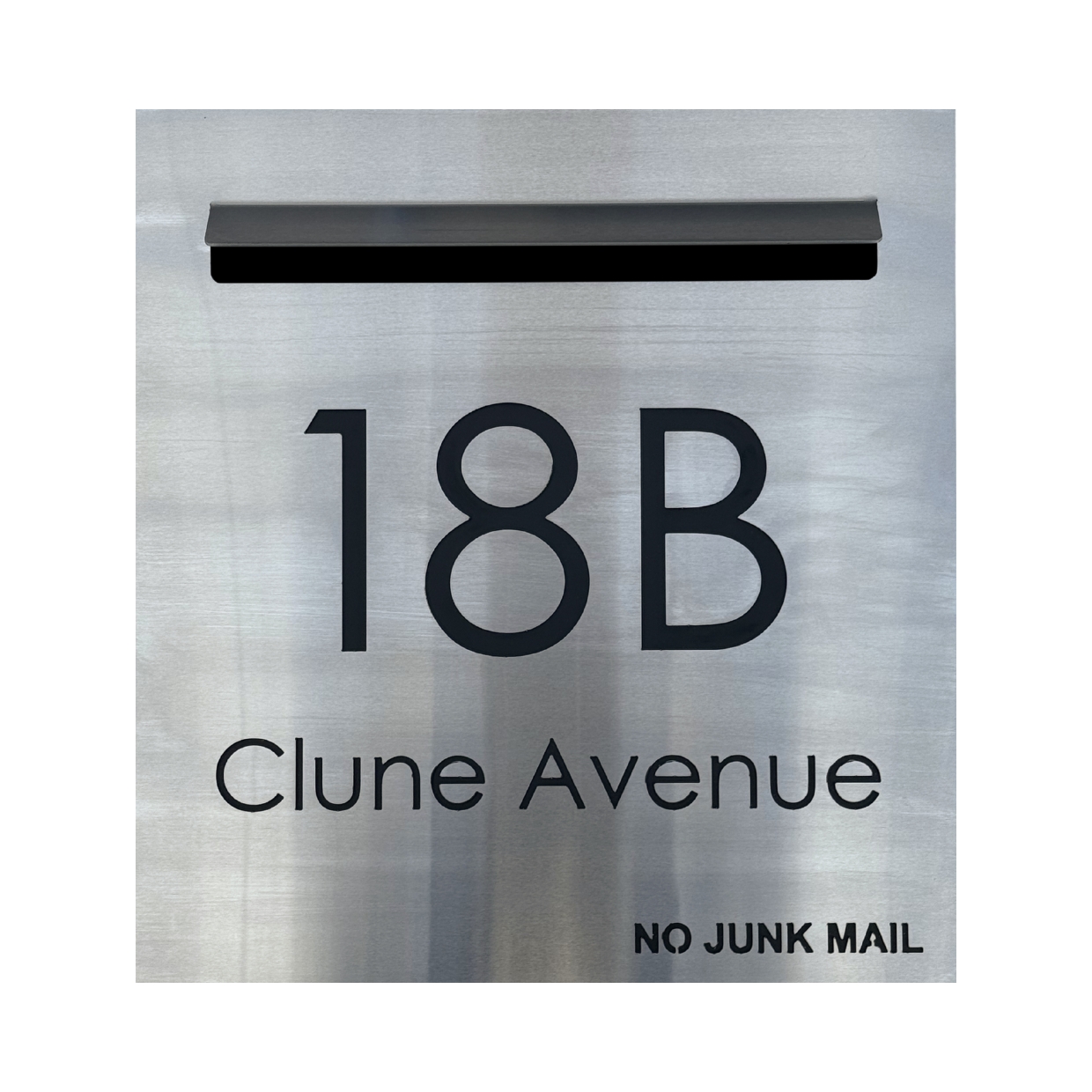 Custom stainless steel faceplate with mail slot and rain hood. Available in 3 sizes and finishes, and fully personalised with your address details. Built to last in all weather.