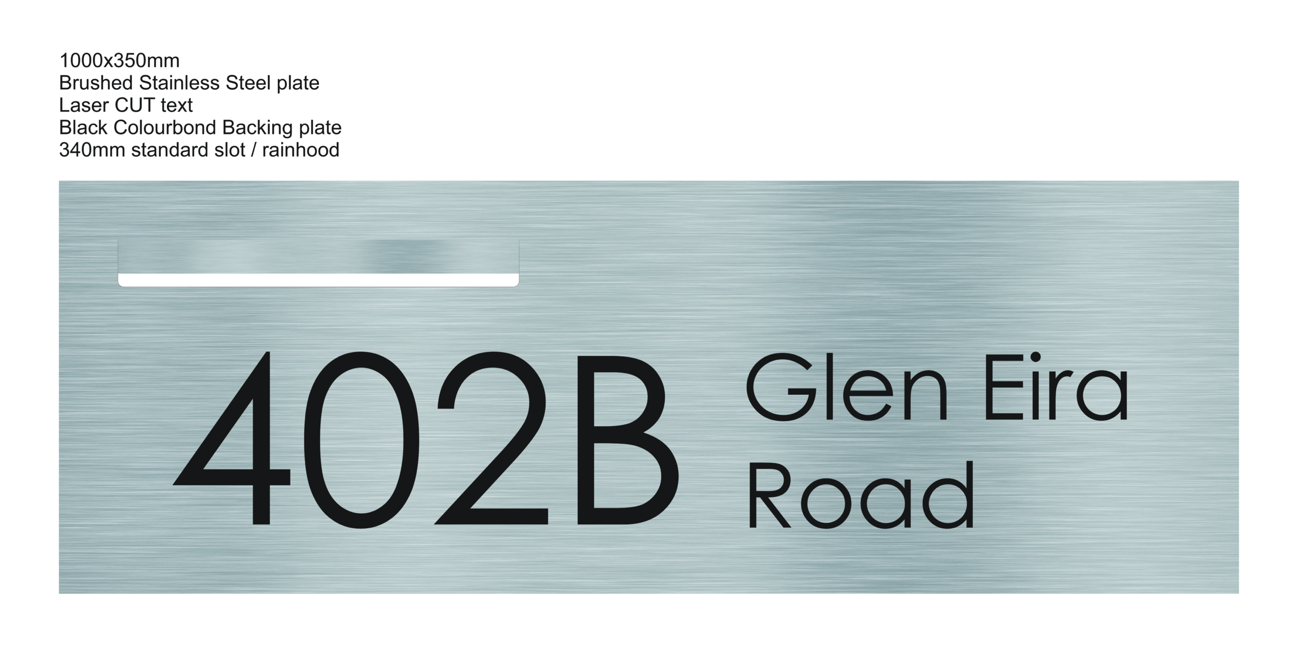 - Multiple Finishes Available – Choose from etched, vinyl-applied, or laser-cut designs with a Colorbond backplate for contrast and visibility.